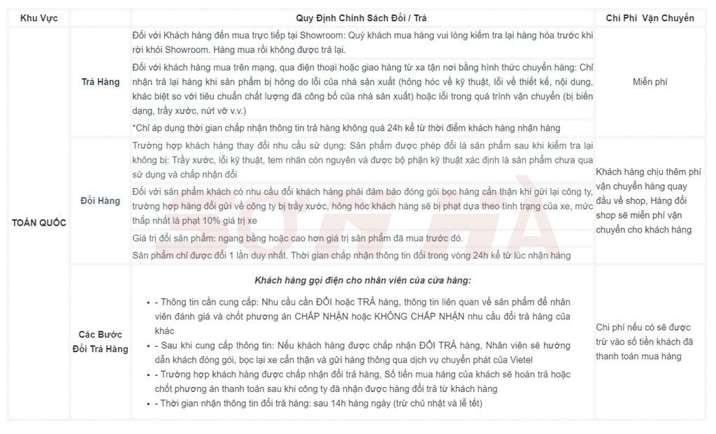 • Lưu ý: Yêu cầu trả hàng chỉ hợp lệ khi được thông báo trong vòng 24h kể từ thời điểm nhận hàng.